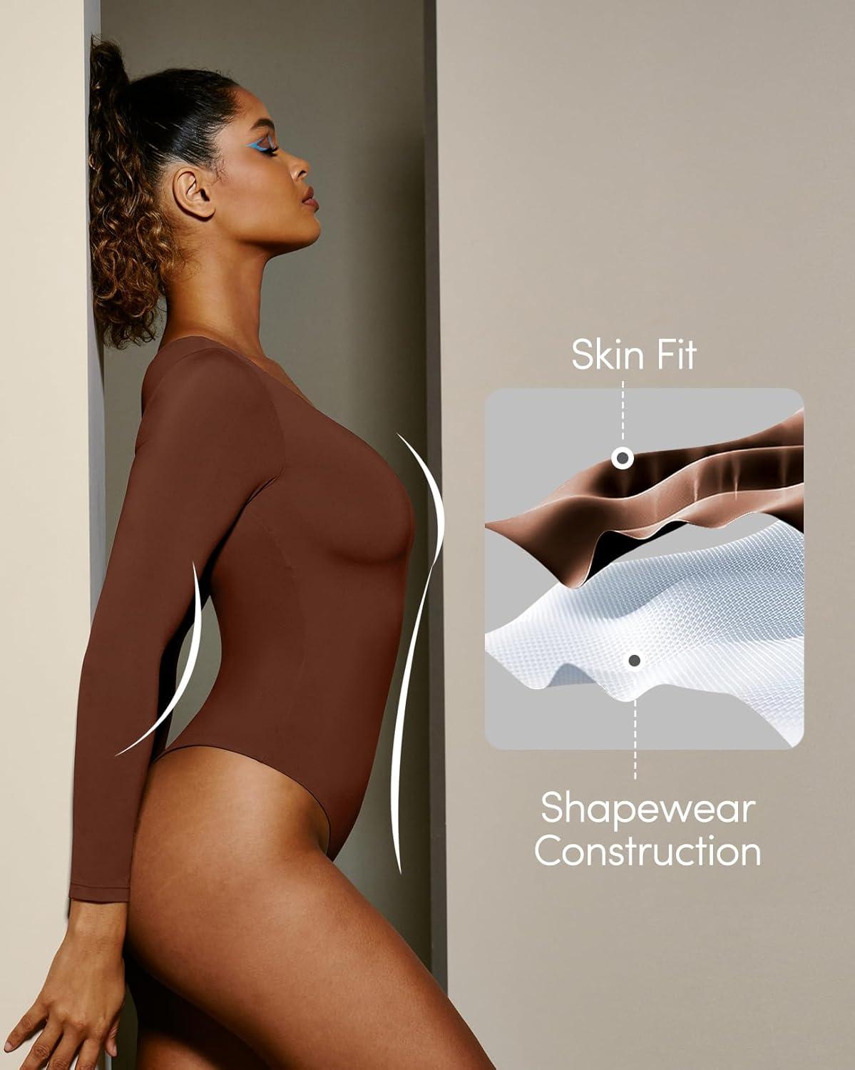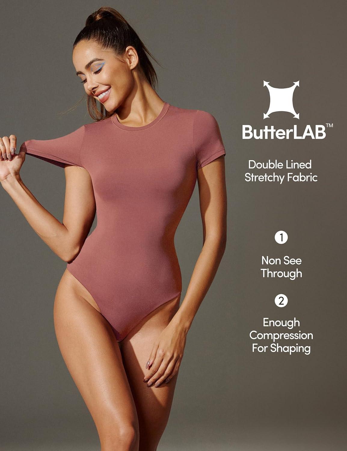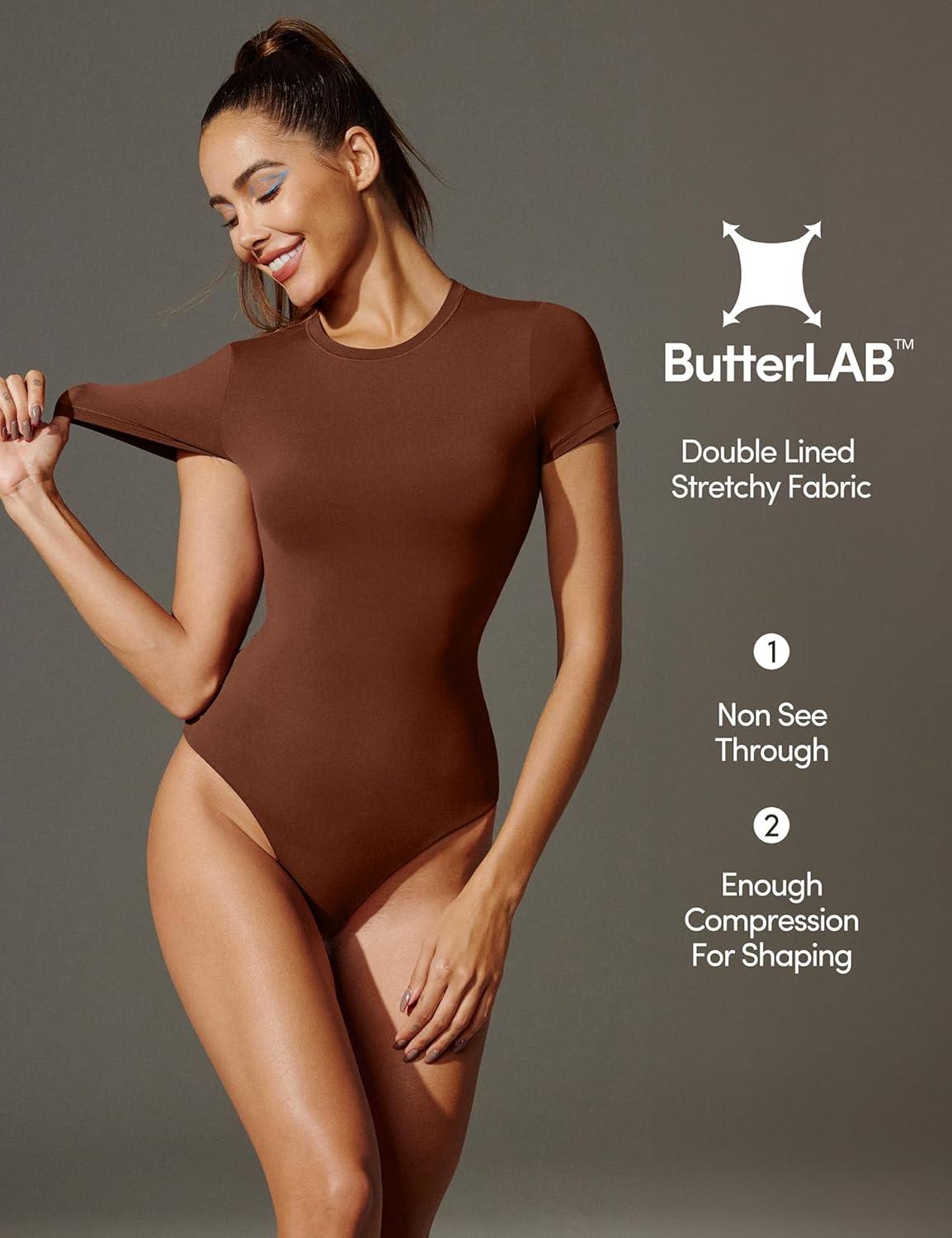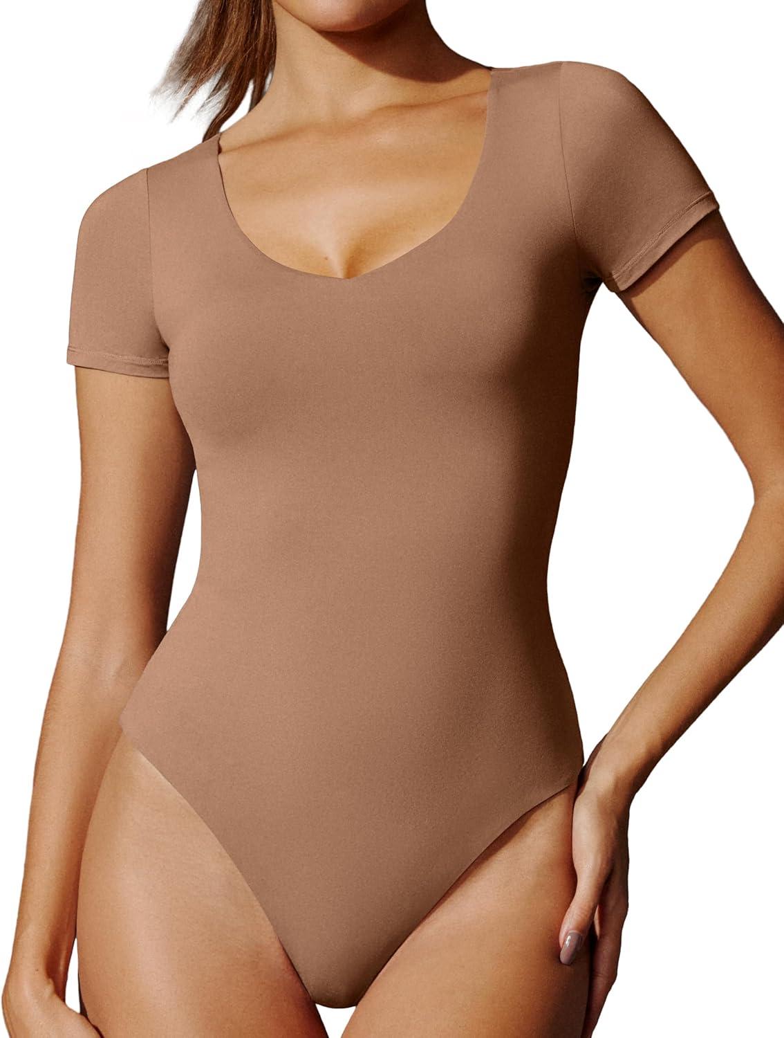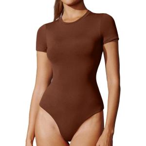 IUGA Bodysuits for Women Tummy Control Crew Neck Short Sleeve Body suits Basic Bodysuit T shirt Tops(Brownie)