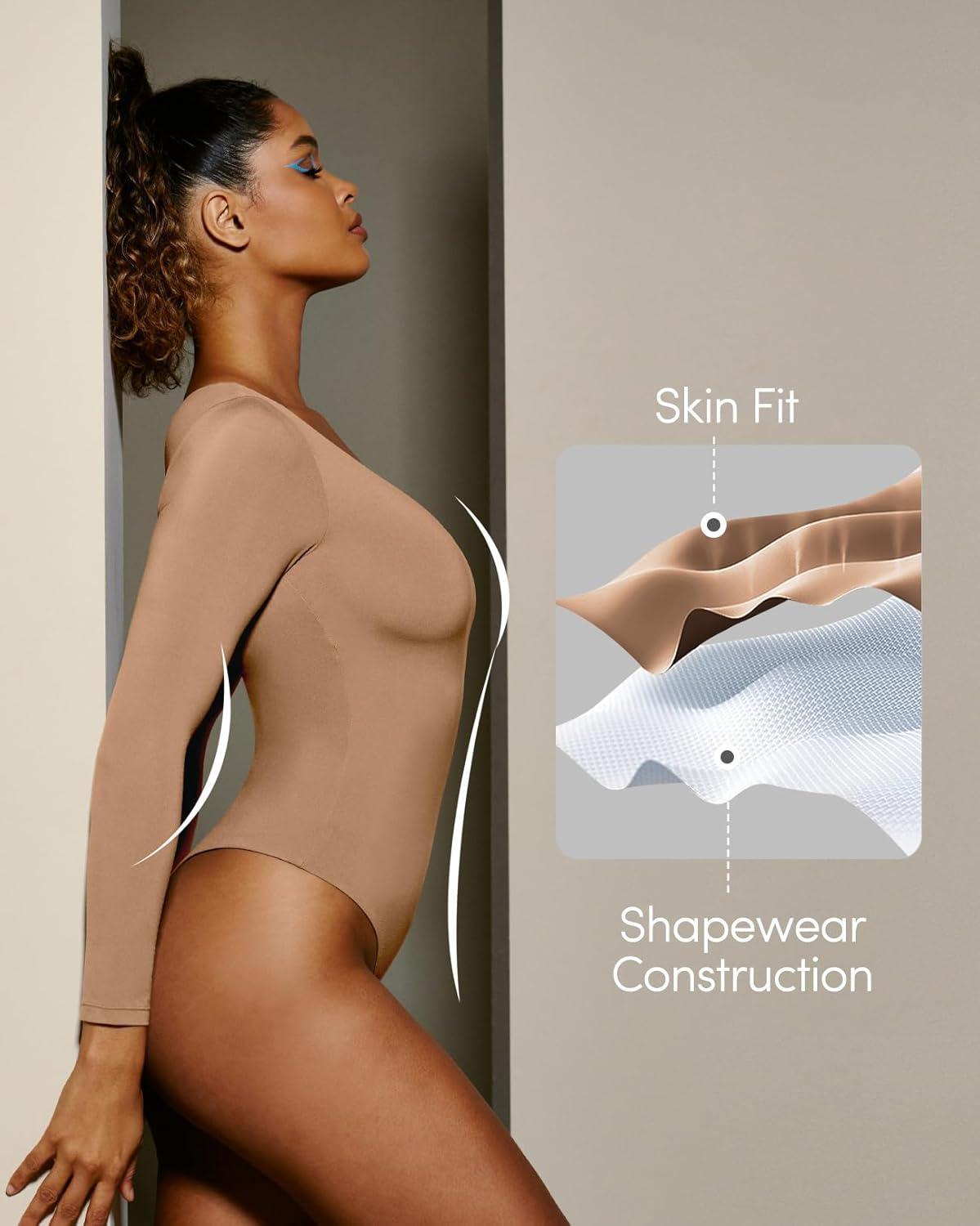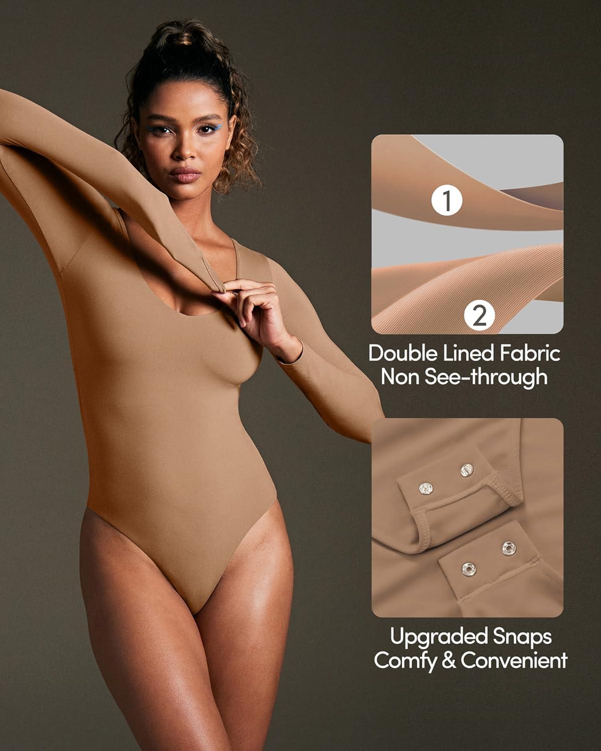 IUGA Bodysuits for Women Tummy Control Body Suits for Womens Compression Slimming Thong Bodysuit V Neck(Latte)