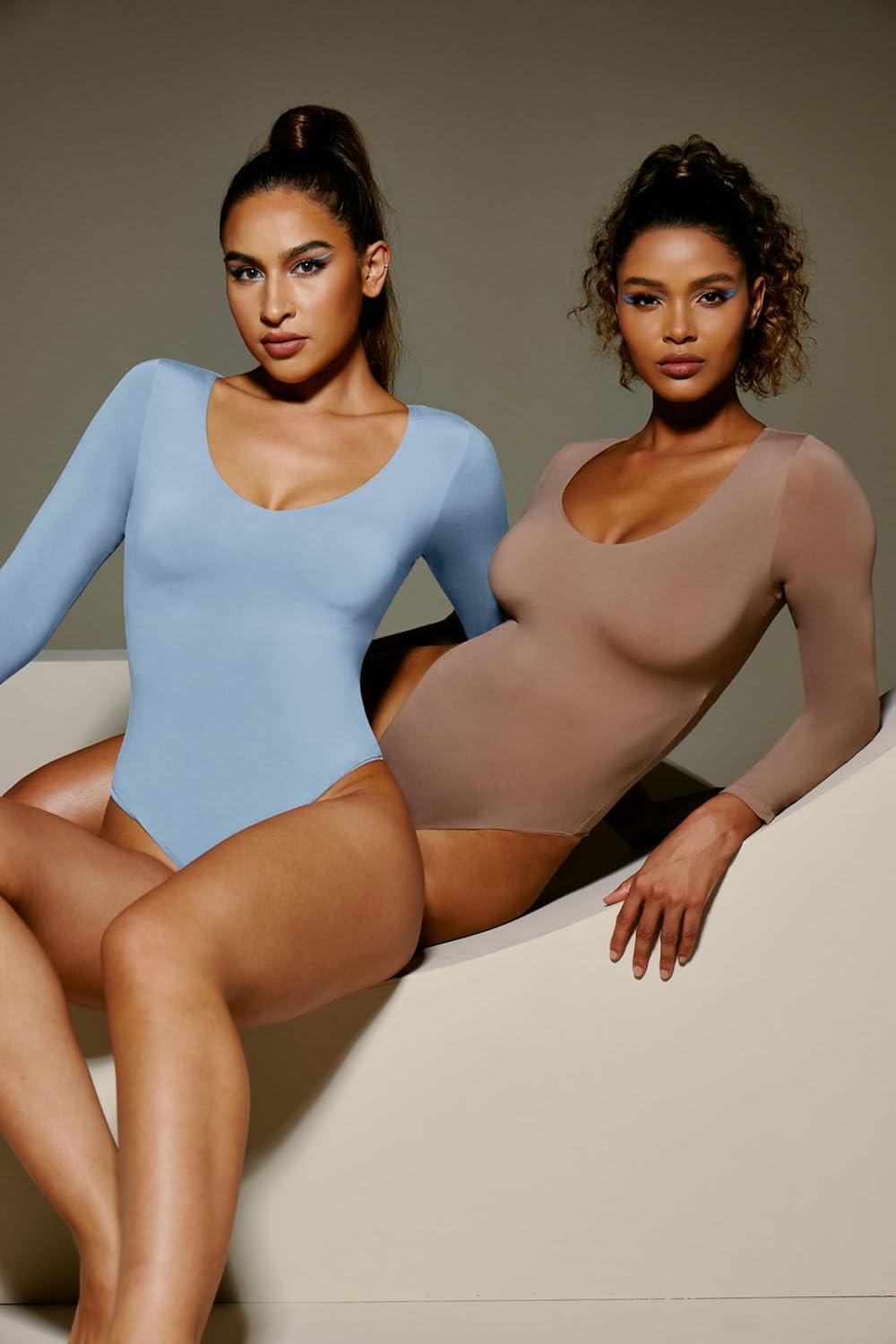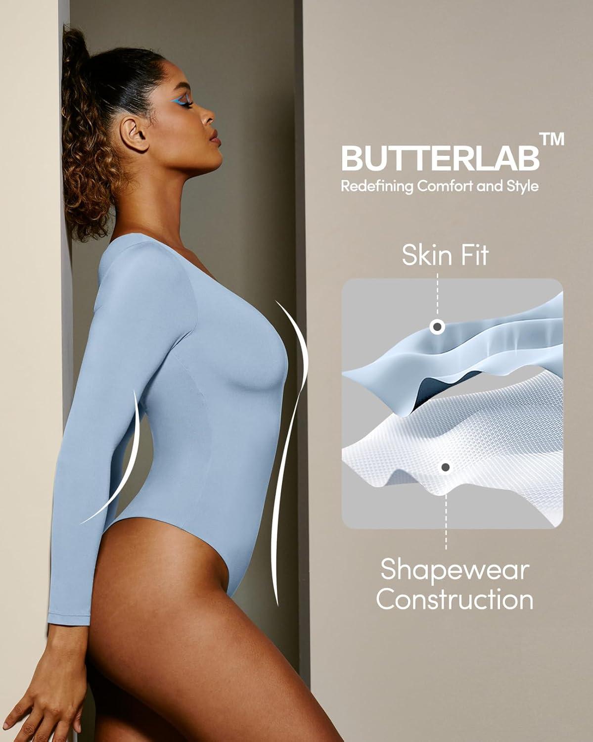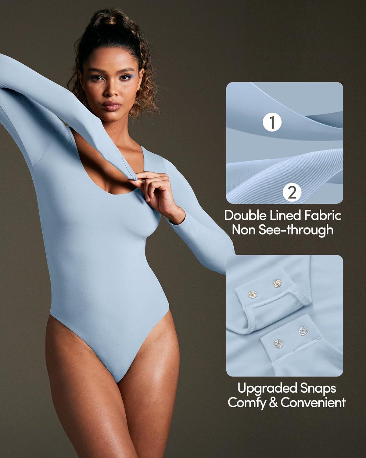 IUGA Bodysuits for Women Tummy Control Body Suits for Womens Compression Slimming Thong Bodysuit V Neck(Soft Blue)