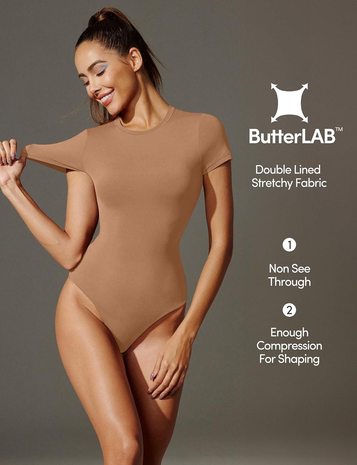 IUGA Bodysuits for Women Tummy Control Crew Neck Short Sleeve Body suits Basic Bodysuit T shirt Tops(Latte)