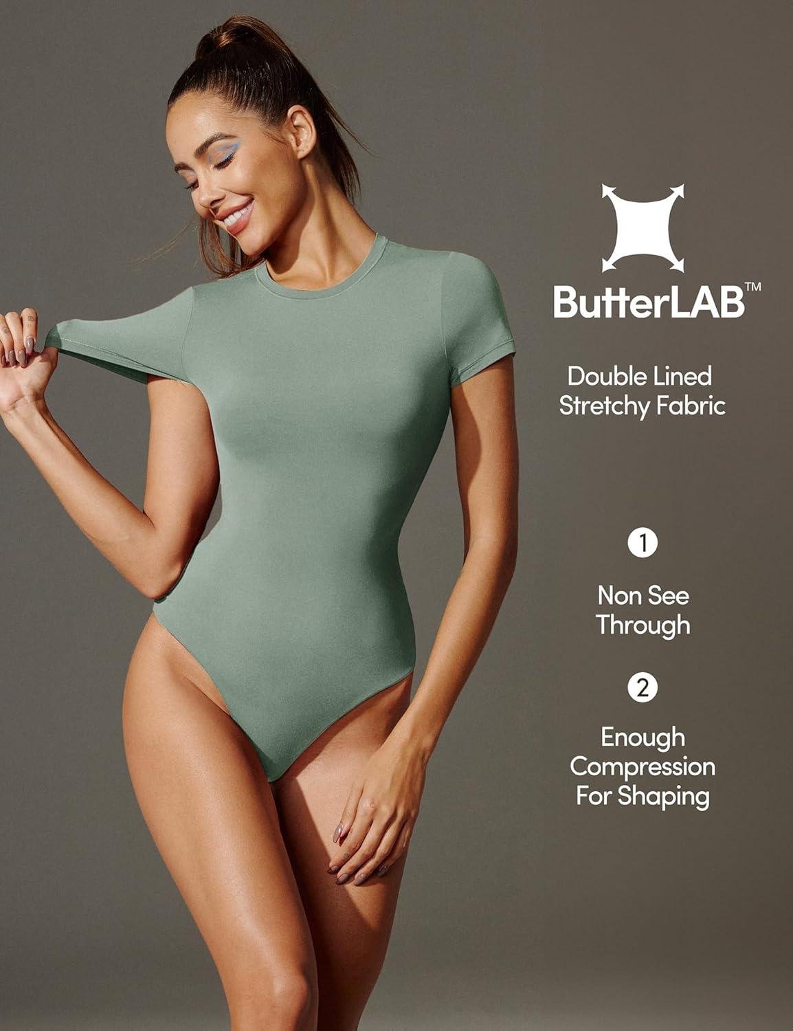 IUGA Bodysuits for Women Tummy Control Crew Neck Short Sleeve Body suits Basic Bodysuit T shirt Tops(Sage)