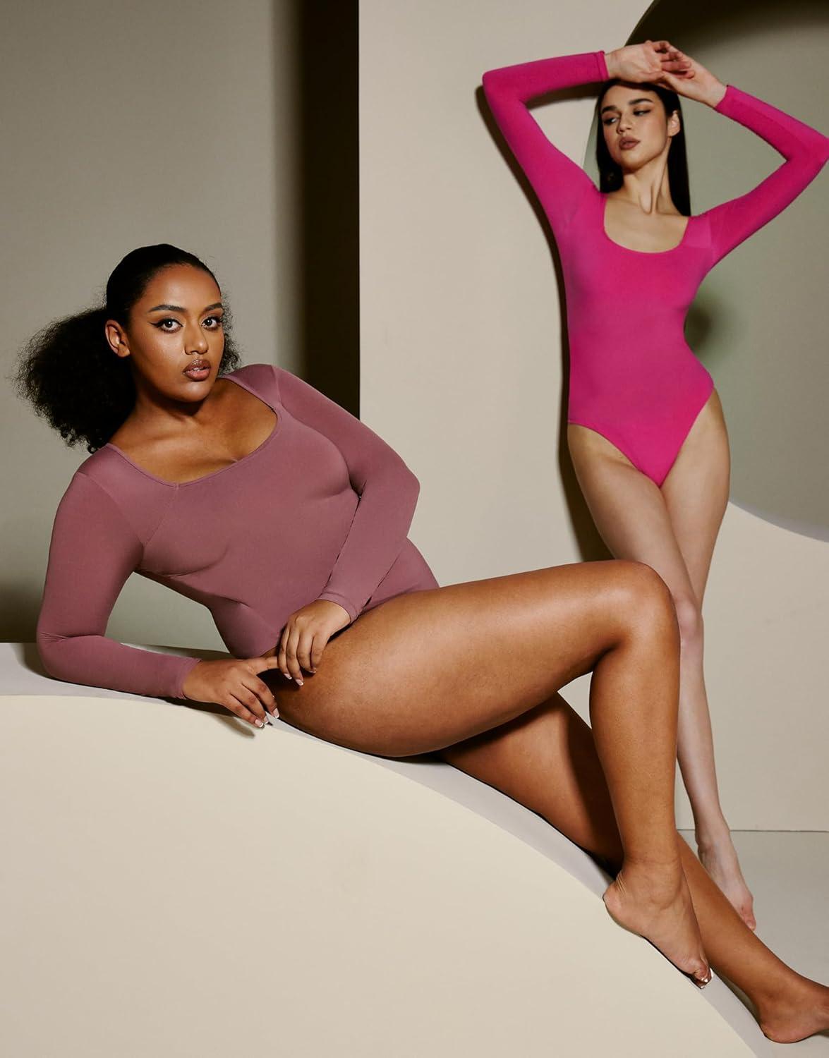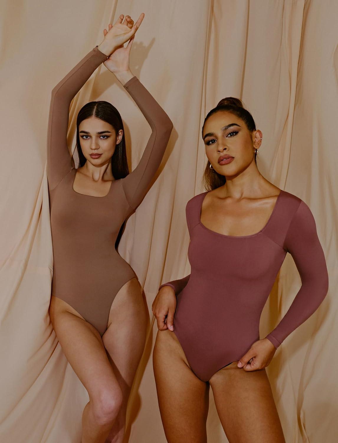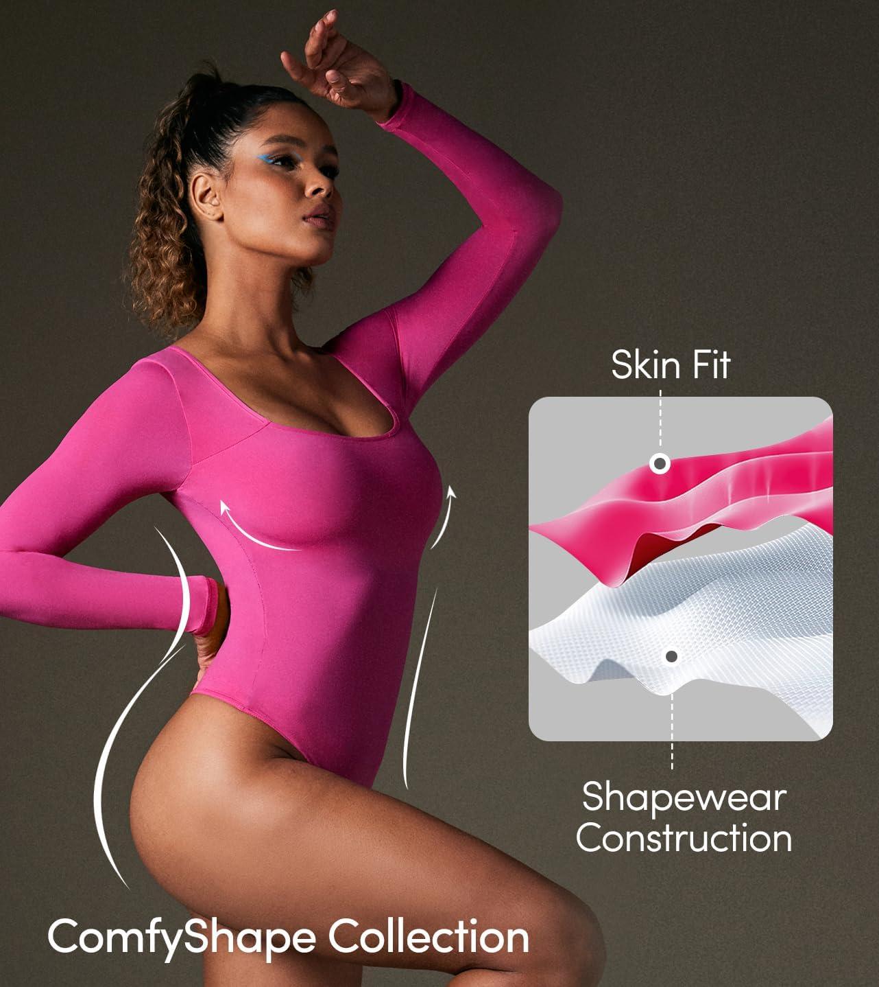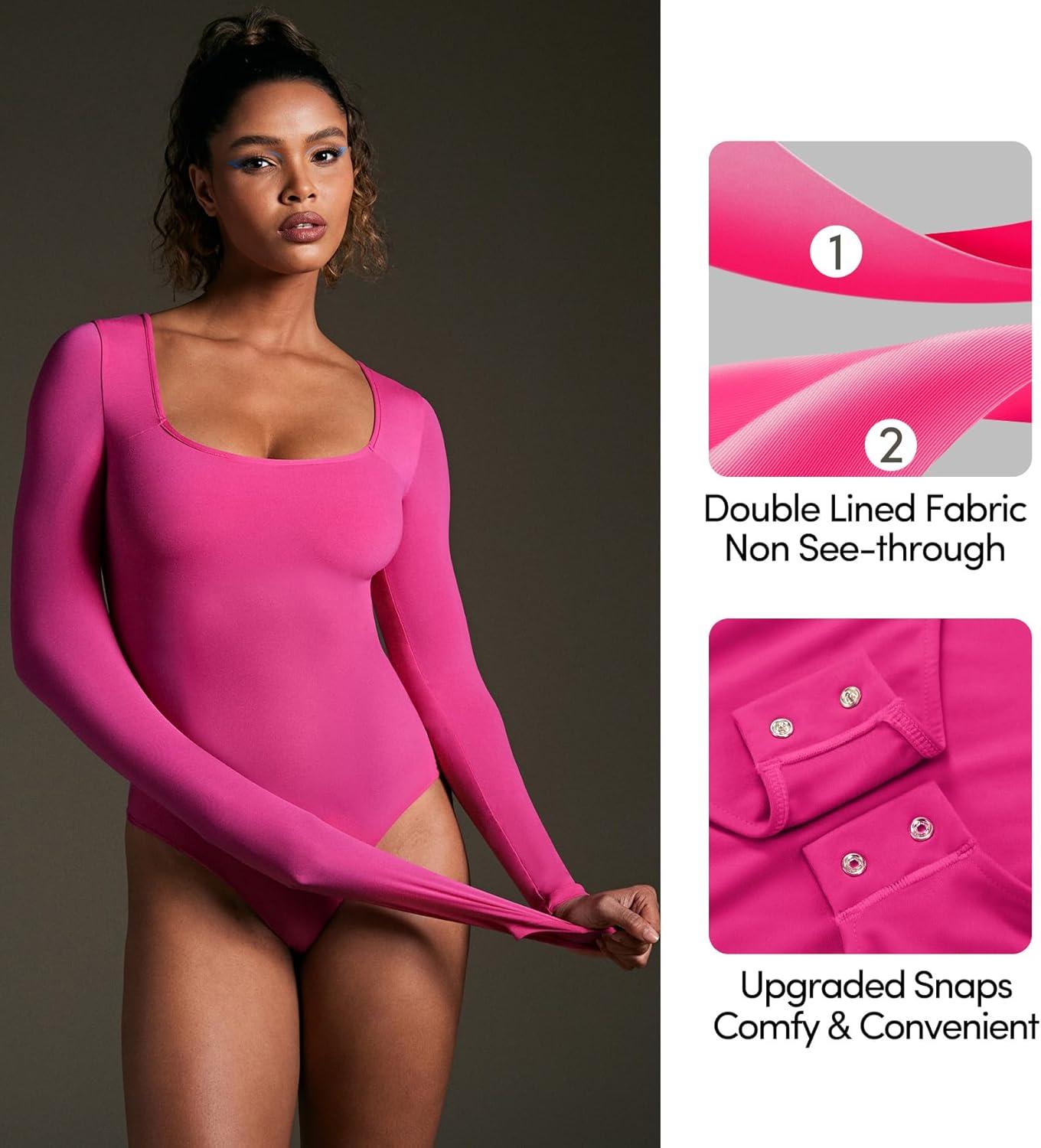 IUGA Long Sleeve Bodysuits for Women Square Neck Bodysuit Shapewear Bodysuit Tummy Control Slimming Body Suit for Womens(Crush)