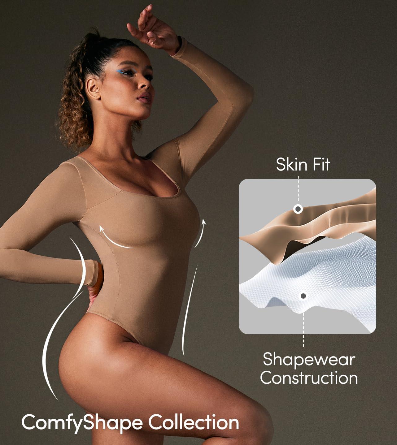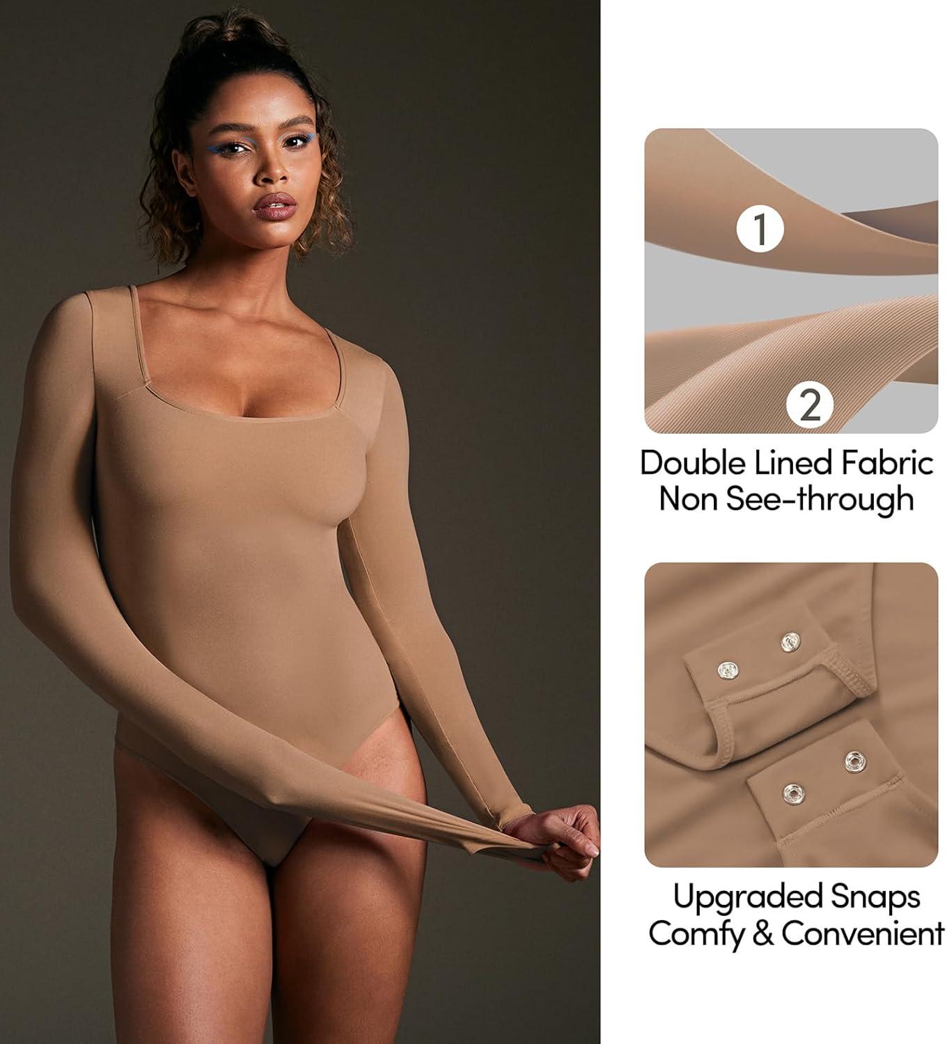 IUGA Long Sleeve Bodysuits for Women Square Neck Bodysuit Shapewear Bodysuit Tummy Control Slimming Body Suit for Womens(Latte)