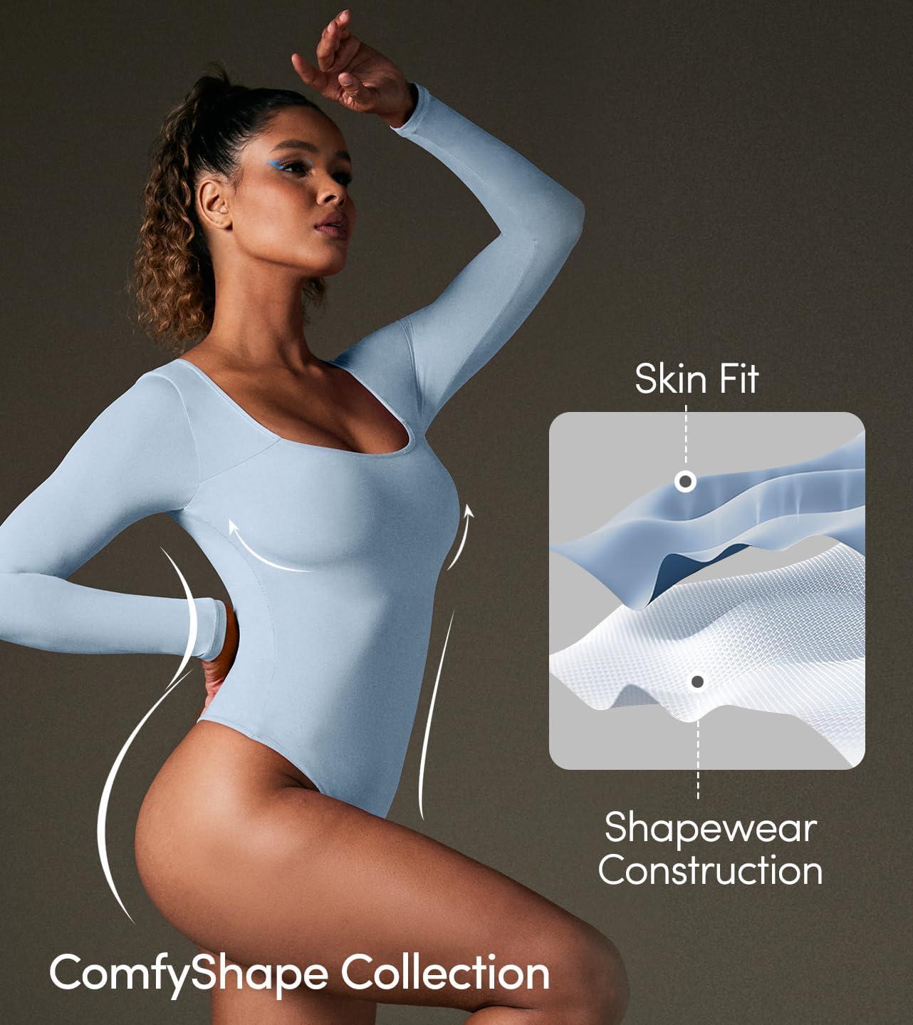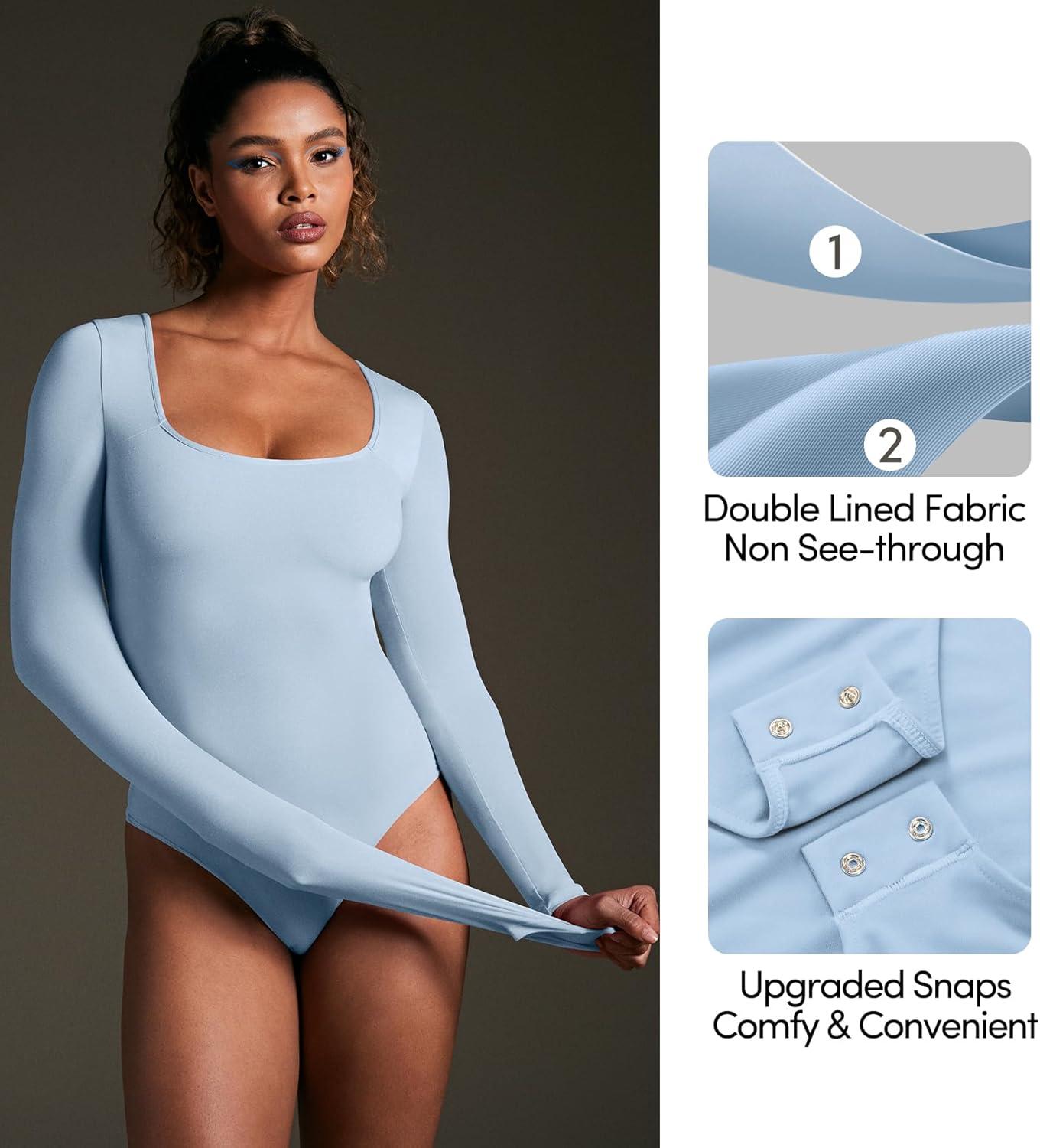 IUGA Long Sleeve Bodysuits for Women Square Neck Bodysuit Shapewear Bodysuit Tummy Control Slimming Body Suit for Womens(Soft Blue)