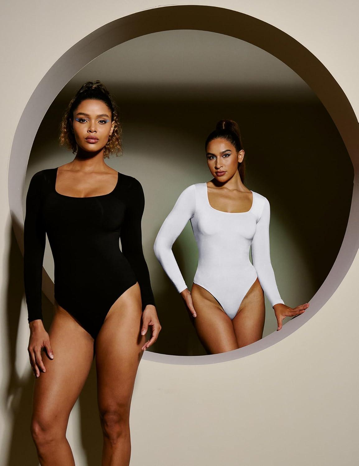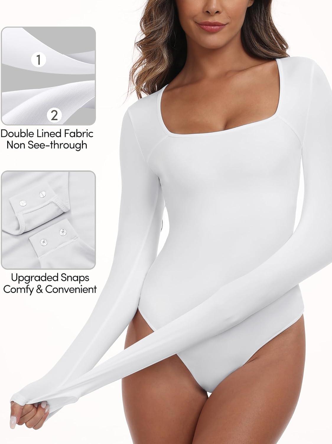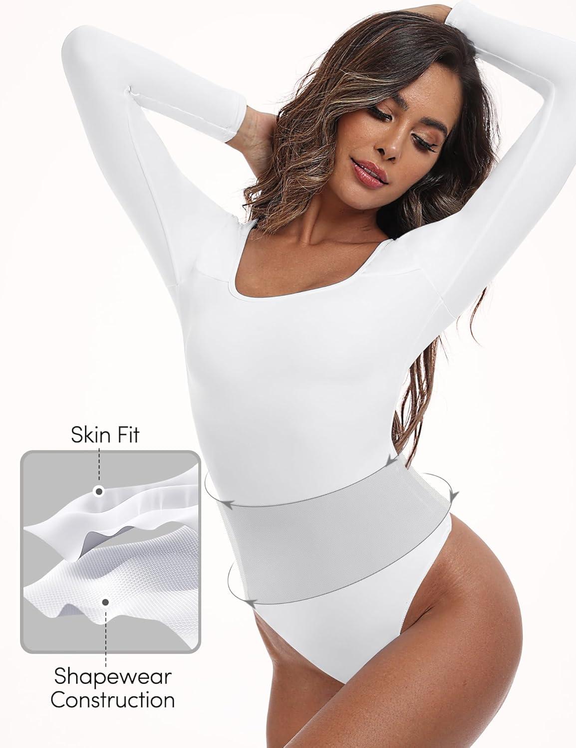 IUGA Long Sleeve Bodysuits for Women Square Neck Bodysuit Shapewear Bodysuit Tummy Control Slimming Body Suit for Womens(White)