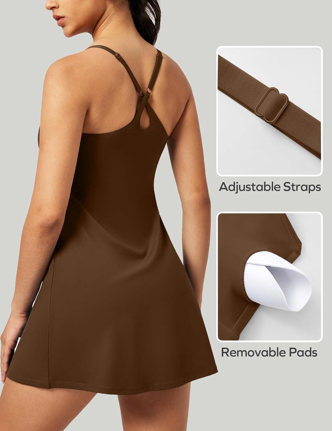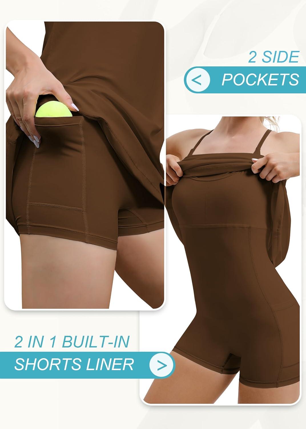 IUGA Tennis Dress for Women Athletic Golf Workout Dress with Built-in Shorts and Bra, Adjustable Straps & Pockets(Clay Brown)