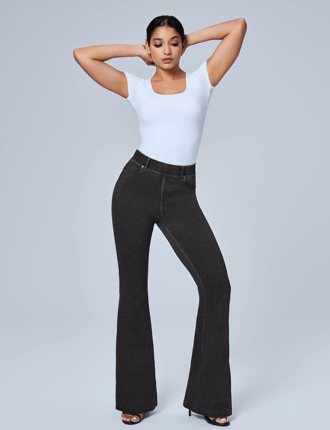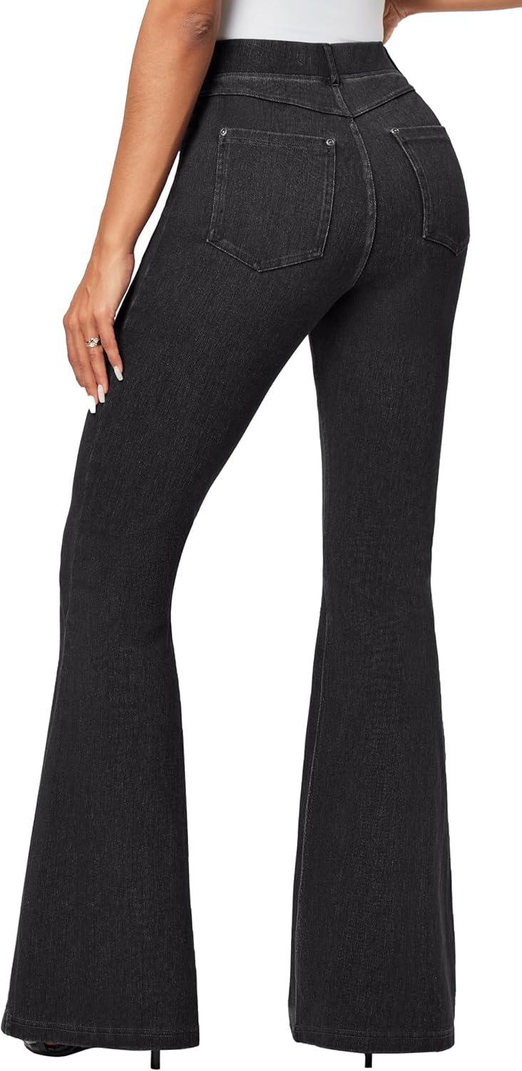 IUGA Bell Bottom Jeans for Women High Waisted Stretchy Pull On Flare Jeans Wide Leg Leggings Tummy Control Flare Pants(Denim Black)