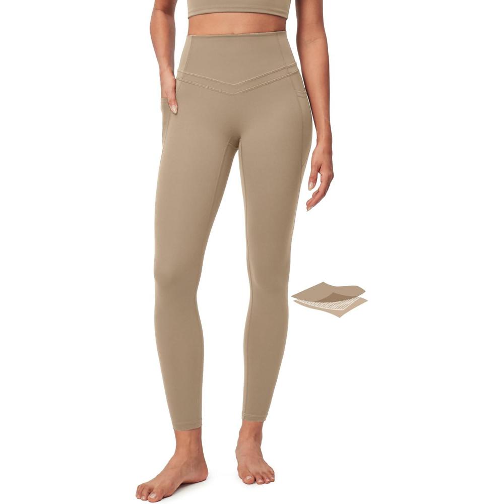IUGA Compression Leggings with Pockets for Women Tummy Control Leggings No Front Seam Workout High Waist Yoga Pants(Light Taupe)