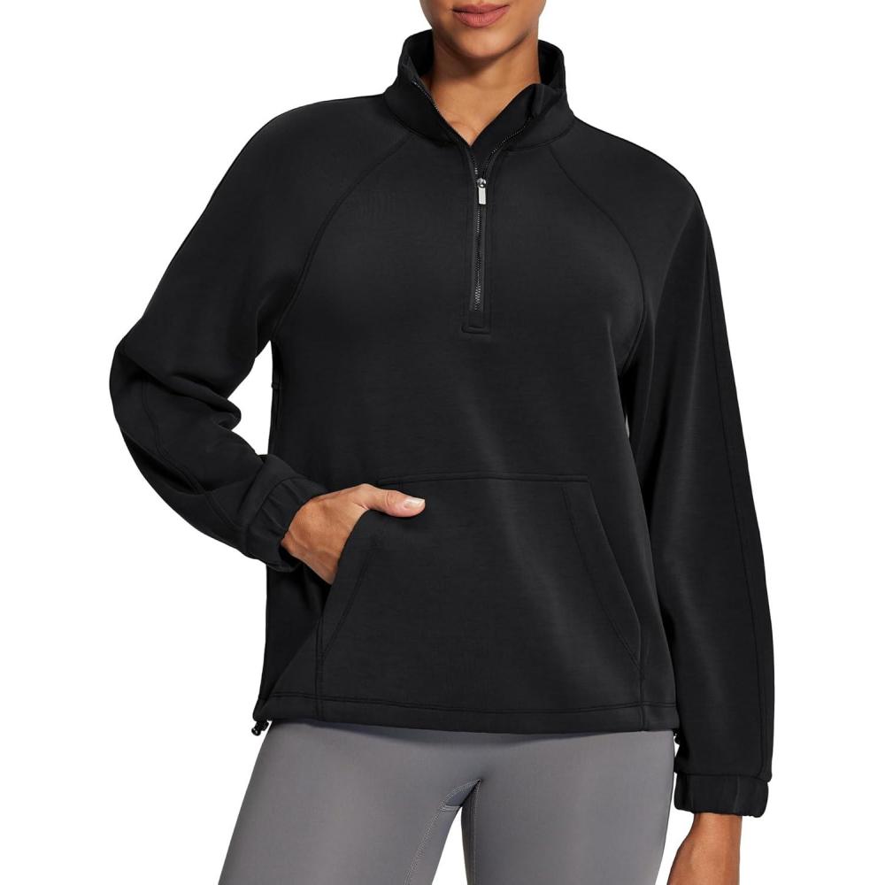 IUGA Soft Quarter Zip Pullover Cropped Sweatshirts for Women Half Zip Pullover Drawstring Hem with Pockets(Black)