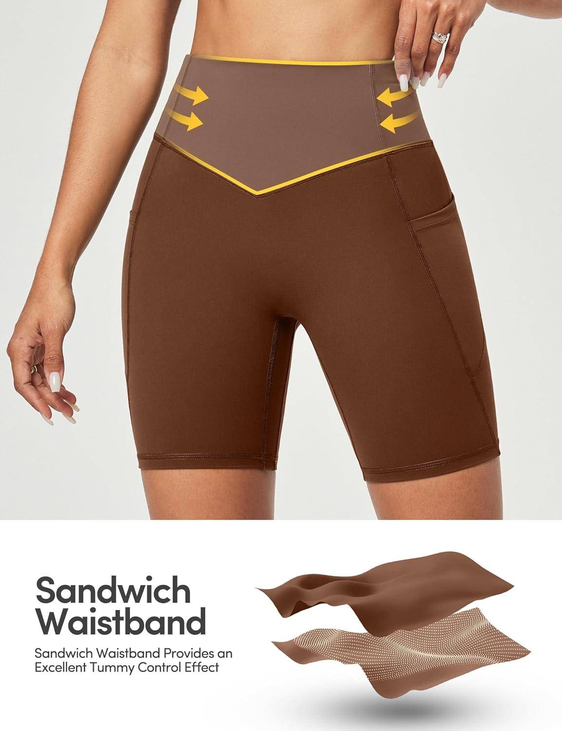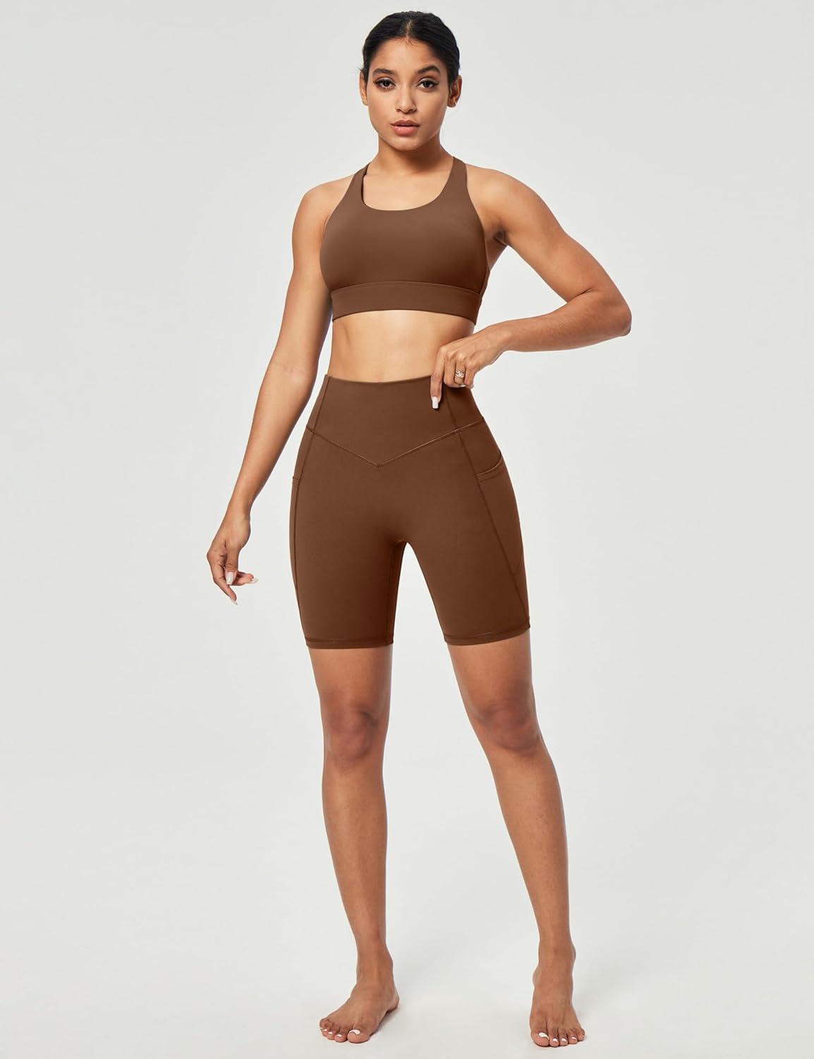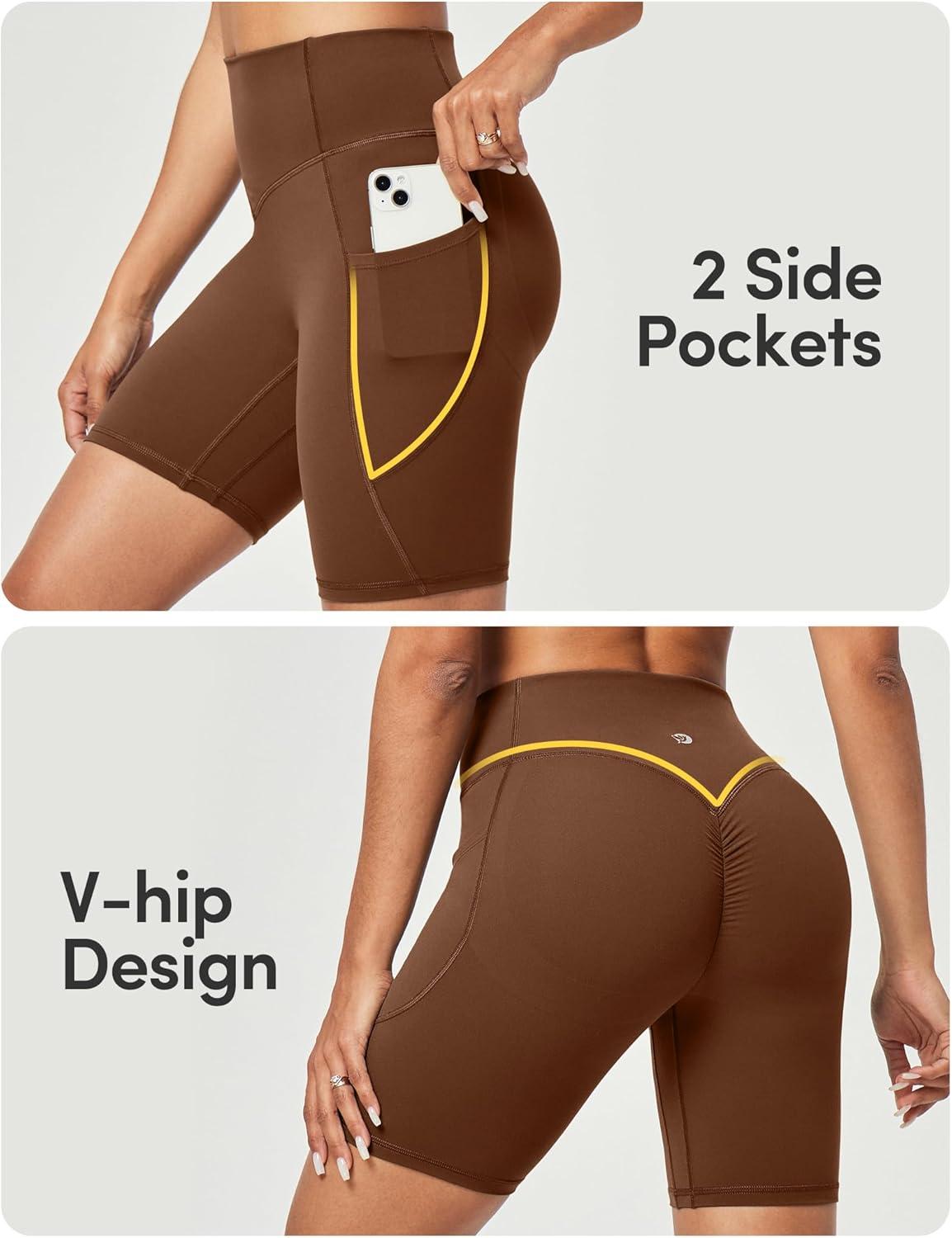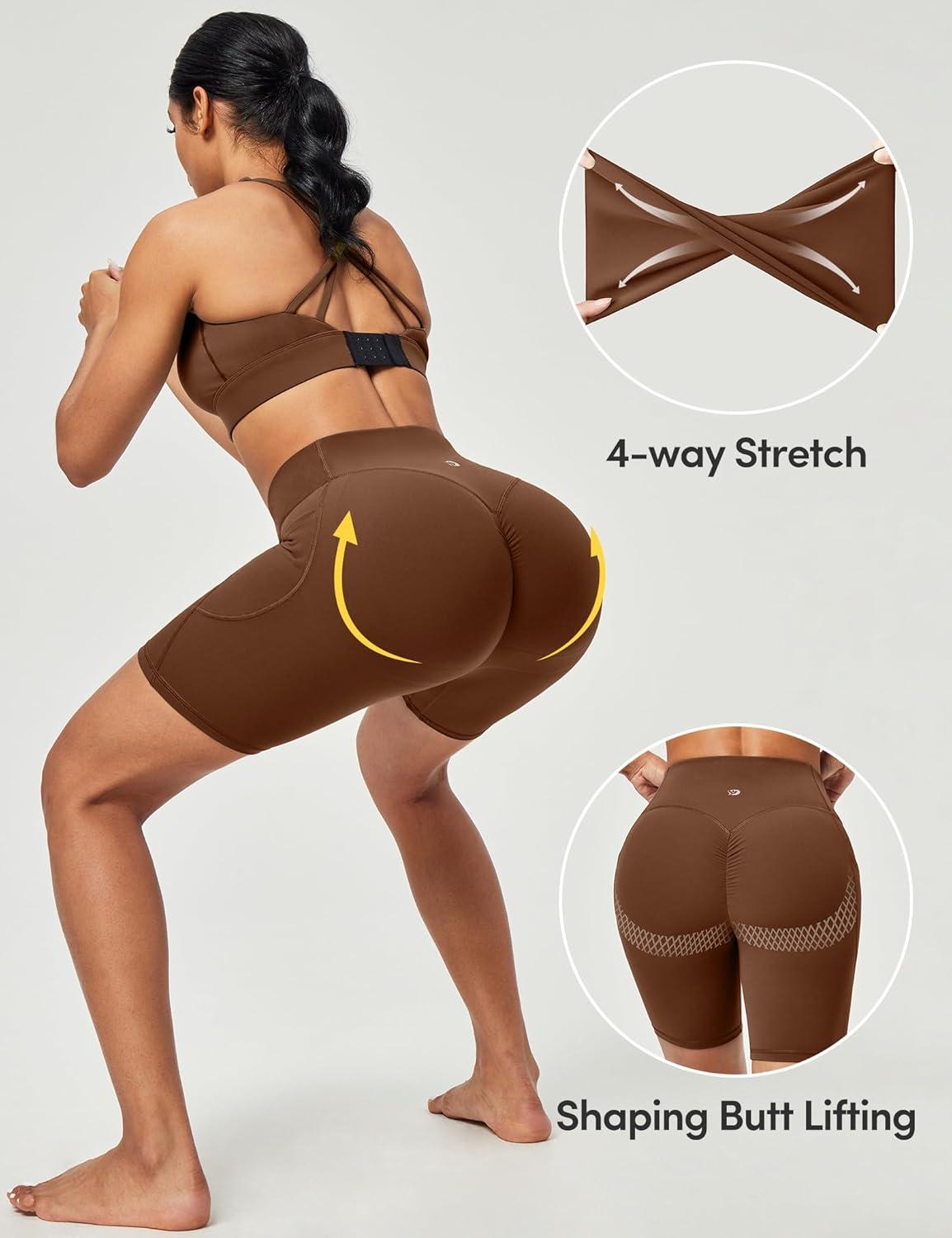 IUGA Gym Shorts Women Scrunch Butt Lifting Tummy Control Biker Shorts with Pockets High Waist Yoga Booty Workout Running 6″(Brown)